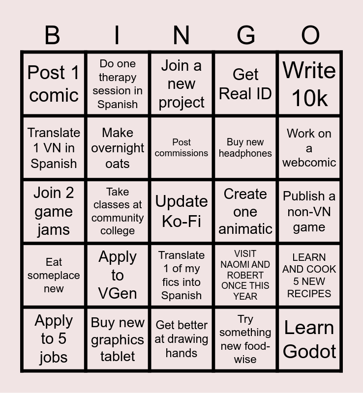 This bingo card has 25 words: Apply to VGen, Get better at drawing hands, Post commissions, Apply to 5 jobs, Write 10k, Post 1 comic, Translate 1 VN in Spanish, Do one therapy session in Spanish, Create one animatic, Translate 1 of my fics into Spanish, Buy new headphones, Join 2 game jams, VISIT NAOMI AND ROBERT ONCE THIS YEAR, LEARN AND COOK 5 NEW RECIPES, Make overnight oats, Learn Godot, Publish a non-VN game, Join a new project, Work on a webcomic, Take classes at community college, Update Ko-Fi, Buy new graphics tablet, Eat someplace new, Get Real ID and Try something new food-wise.