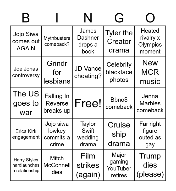 This bingo card has a free space and 24 words: Jojo siwa lowkey commits a crime, Mitch McConnell dies, JD Vance cheating?, Harry Styles hardlaunches a relationship, Heated rivalry x Olympics moment, Jojo Siwa comes out AGAIN, Joe Jonas controversy, Mythbusters comeback?, Bbno$ comeback, Taylor Swift wedding drama, Celebrity blackface photos, The US goes to war, Cruise ship drama, Far right figure outed as gay, Grindr for lesbians, Major gaming YouTuber retires, Jenna Marbles comeback, James Dashner drops a book, New MCR music, Falling In Reverse breaks up, Trump dies (please), Erica Kirk engagement, Tyler the Creator drama and Film strikes (again).