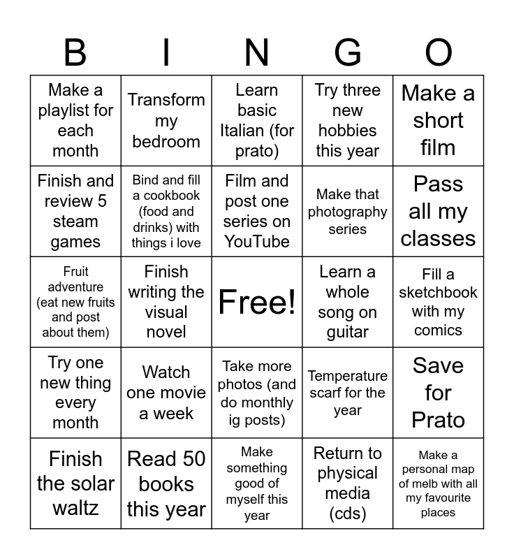 This bingo card has a free space and 24 words: Watch one movie a week, Read 50 books this year, Film and post one series on YouTube, Finish the solar waltz, Make a short film, Make a playlist for each month, Finish and review 5 steam games, Transform my bedroom, Learn a whole song on guitar, Take more photos (and do monthly ig posts), Make that photography series, Fruit adventure (eat new fruits and post about them), Temperature scarf for the year, Save for Prato, Bind and fill a cookbook (food and drinks) with things i love, Return to physical media (cds), Fill a sketchbook with my comics, Learn basic Italian (for prato), Pass all my classes, Finish writing the visual novel, Make a personal map of melb with all my favourite places, Try one new thing every month, Try three new hobbies this year and Make something good of myself this year.