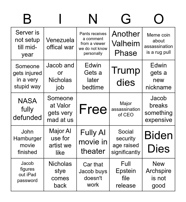 This bingo card has a free space and 28 words: Biden Dies, New Friend, Trump dies, Full Epstein file release, Someone gets injured in a very stupid way, Pants receives a comment from a viewer we do not know personally, Venezuela offical war, John Hamburger movie finished, Major assassination of CEO, Jacob figures out iPad password, NASA fully defunded, Another Valheim Phase, Nicholas stye comes back, Car that Jacob buys doesn't work, Edwin gets a new nickname, Leave Valor early, Major AI use for artist we like, Jacob and or Nicholas job, Edwin Gets a later bedtime, Fully AI movie in theater, Server is not setup till mid-year, Thursdays by pants receives surprising amount of attention, New Archspire is not good, Someone at Valor gets very mad at us, Jacob breaks something expensive, Social security age raised significantly, Meme coin about assassination is a rug pull and Vildhjarta tour.