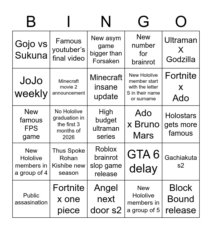 This bingo card has a free space and 24 words: Thus Spoke Rohan Kishibe new season, Fortnite x one piece, Minecraft insane update, Public assasination, Ultraman X Godzilla, Gojo vs Sukuna, JoJo weekly, Famous youtuber’s final video, Ado x Bruno Mars, Roblox brainrot slop game release, New Hololive member start with the letter S in their name or surname, New famous FPS game, GTA 6 delay, Gachiakuta s2, Minecraft movie 2 announcement, New Hololive members in a group of 5, Holostars gets more famous, New asym game bigger than Forsaken, Fortnite x Ado, No Hololive graduation in the first 3 months of 2026, Block Bound release, New Hololive members in a group of 4, New number for brainrot and Angel next door s2.
