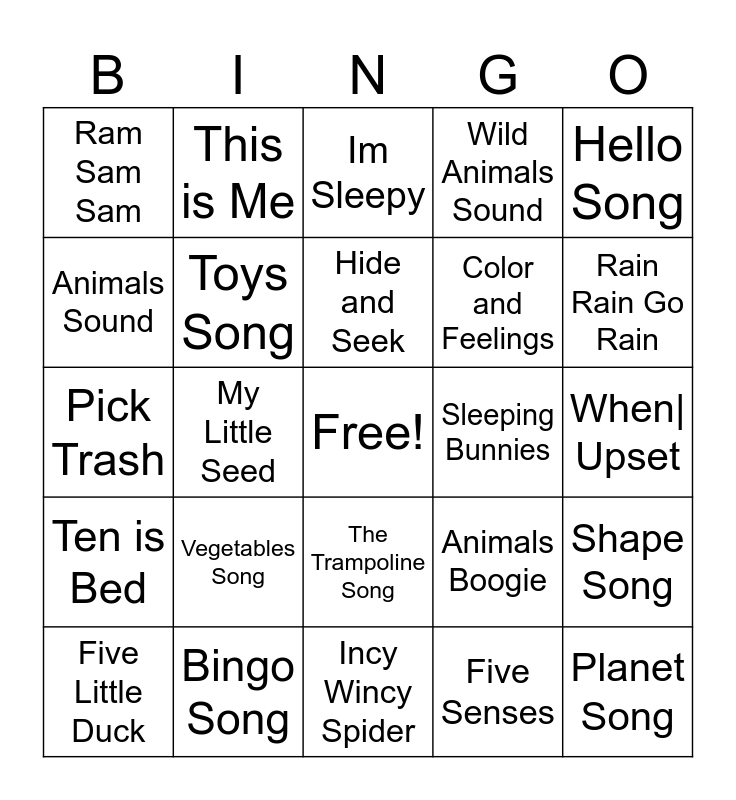 This bingo card has a free space and 38 words: Seven Continents, Manners Song, Month of the Year, Toys Song, Shape Song, Vegetables Song, Hide and Seek, Weather Song, Hello Song, Color and Feelings, My Little Seed, Wild Animals Sound, Planet Song, When| Upset, Animals Sound, Ten is Bed, Me If Catch, Im Sleepy, Happy Re Know’s Your, Sleeping Bunnies, Ram Sam Sam, Bingo Song, Rain Rain Go Rain, Five Little Duck, Bunny Hop, Incy Wincy Spider, |Spy, Fly a Kite, When| Grow Up, Let’s Play EveryDay, Funny Face, The Trampoline Song, Five Senses, This is Me, Sharing Caring, Animals Boogie, Pick Trash and Wheels of the Bus.