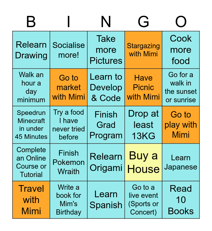 This bingo card has 25 words: Finish Pokemon Wraith, Learn Spanish, Learn to Develop & Code, Travel with Mimi, Cook more food, Relearn Drawing, Walk an hour a day minimum, Socialise more!, Drop at least 13KG, Relearn Origami, Have Picnic with Mimi, Speedrun Minecraft in under 45 Minutes, Buy a House, Learn Japanese, Go to market with Mimi, Read 10 Books, Go to play with Mimi, Take more Pictures, Go for a walk in the sunset or sunrise, Try a food I have never tried before, Finish Grad Program, Write a book for Mim's Birthday, Complete an Online Course or Tutorial, Stargazing with Mimi and Go to a live event (Sports or Concert).