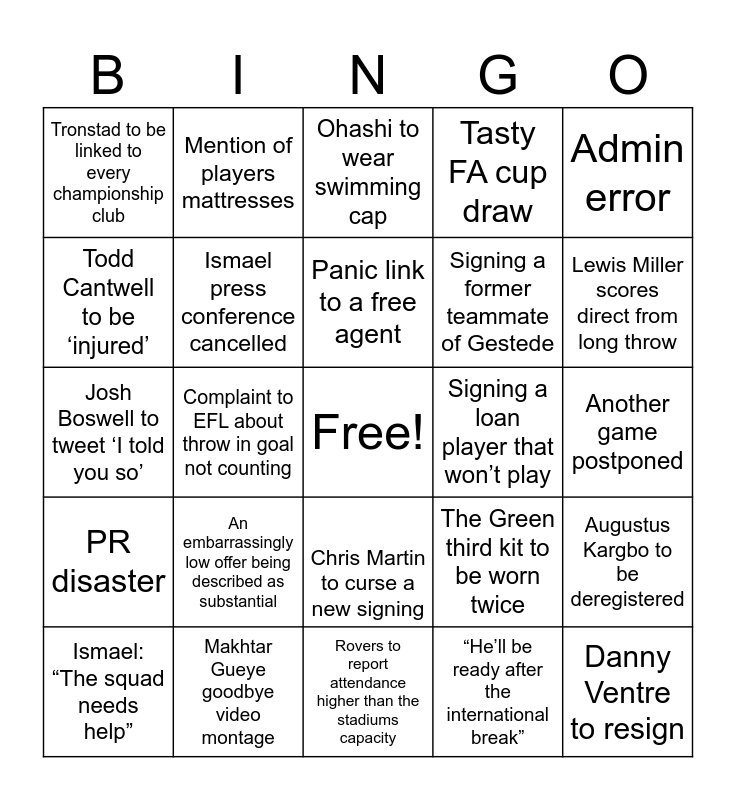 This bingo card has a free space and 24 words: An embarrassingly low offer being described as substantial, Makhtar Gueye goodbye video montage, Panic link to a free agent, Ismael: “The squad needs help”, Admin error, Tronstad to be linked to every championship club, Todd Cantwell to be ‘injured’, Mention of players mattresses, Signing a loan player that won’t play, Chris Martin to curse a new signing, Signing a former teammate of Gestede, Josh Boswell to tweet ‘I told you so’, The Green third kit to be worn twice, Augustus Kargbo to be deregistered, Ismael press conference cancelled, “He’ll be ready after the international break”, Another game postponed, Ohashi to wear swimming cap, Lewis Miller scores direct from long throw, Complaint to EFL about throw in goal not counting, Danny Ventre to resign, PR disaster, Tasty FA cup draw and Rovers to report attendance higher than the stadiums capacity.