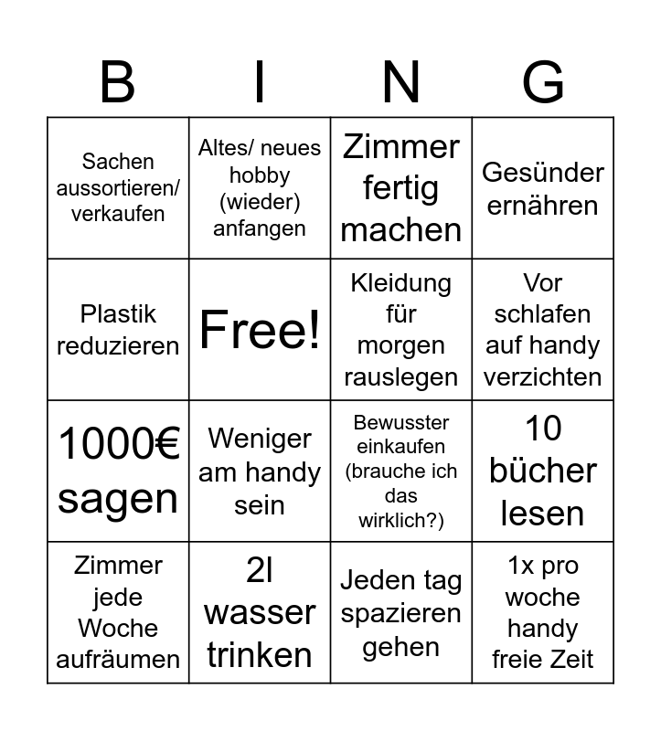 This bingo card has 16 words: 2l wasser trinken, 10 bücher lesen, Zimmer fertig machen, Sachen aussortieren/ verkaufen, 1000€ sagen, Altes/ neues hobby (wieder) anfangen, Bewusster einkaufen (brauche ich das wirklich?), Jeden tag spazieren gehen, Plastik reduzieren, Free!, Zimmer jede Woche aufräumen, Gesünder ernähren, Weniger am handy sein, Vor schlafen auf handy verzichten, Kleidung für morgen rauslegen and 1x pro woche handy freie Zeit.