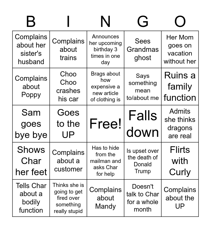 This bingo card has a free space and 24 words: Complains about a customer, Thinks she is going to get fired over something really stupid, Brags about how expensive a new article of clothing is, Tells Char about a bodily function, Her Mom goes on vacation without her, Complains about her sister's husband, Complains about Poppy, Complains about trains, Falls down, Has to hide from the mailman and asks Char for help, Says something mean to/about me, Sam goes bye bye, Is upset over the death of Donald Trump, Flirts with Curly, Choo Choo crashes his car, Doesn't talk to Char for a whole month, Admits she thinks dragons are real, Announces her upcoming birthday 3 times in one day, Ruins a family function, Goes to the UP, Complains about the UP, Shows Char her feet, Sees Grandmas ghost and Complains about Mandy.
