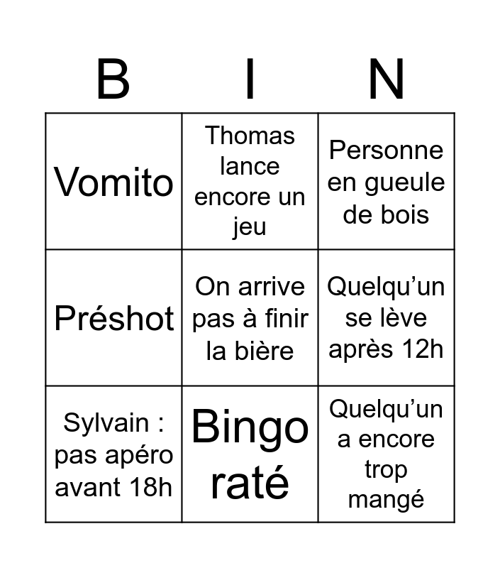This bingo card has a free space and 8 words: Quelqu’un se lève après 12h, Personne en gueule de bois, Thomas lance encore un jeu, Sylvain : pas apéro avant 18h, Vomito, Quelqu’un a encore trop mangé, Préshot and Bingo raté.