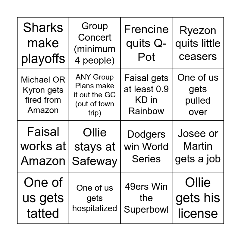 This bingo card has 16 words: One of us gets hospitalized, Josee or Martin gets a job, Frencine quits Q-Pot, Sharks make playoffs, Faisal works at Amazon, Group Concert (minimum 4 people), Dodgers win World Series, 49ers Win the Superbowl, Michael OR Kyron gets fired from Amazon, ANY Group Plans make it out the GC (out of town trip), One of us gets tatted, Ryezon quits little ceasers, Ollie stays at Safeway, One of us gets pulled over, Faisal gets at least 0.9 KD in Rainbow and Ollie gets his license.