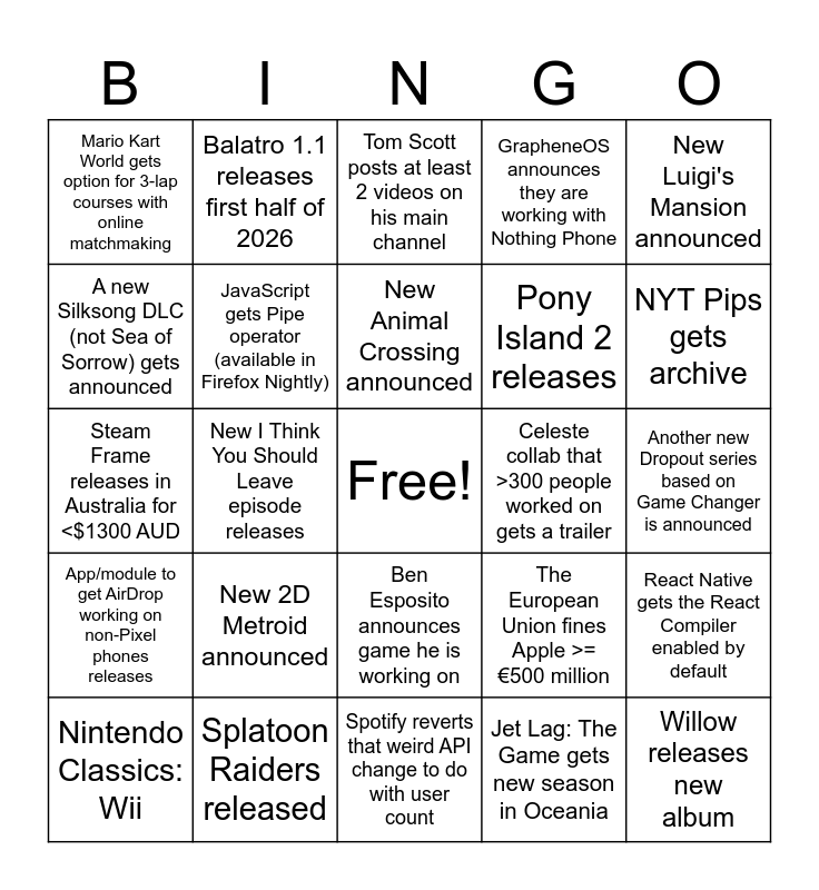 This bingo card has a free space and 24 words: New 2D Metroid announced, Splatoon Raiders released, New Animal Crossing announced, Nintendo Classics: Wii, New Luigi's Mansion announced, Mario Kart World gets option for 3-lap courses with online matchmaking, A new Silksong DLC (not Sea of Sorrow) gets announced, Balatro 1.1 releases first half of 2026, Celeste collab that >300 people worked on gets a trailer, Ben Esposito announces game he is working on, Pony Island 2 releases, Steam Frame releases in Australia for <$1300 AUD, The European Union fines Apple >= €500 million, React Native gets the React Compiler enabled by default, JavaScript gets Pipe operator (available in Firefox Nightly), Jet Lag: The Game gets new season in Oceania, Another new Dropout series based on Game Changer is announced, Tom Scott posts at least 2 videos on his main channel, NYT Pips gets archive, New I Think You Should Leave episode releases, Willow releases new album, App/module to get AirDrop working on non-Pixel phones releases, GrapheneOS announces they are working with Nothing Phone and Spotify reverts that weird API change to do with user count.