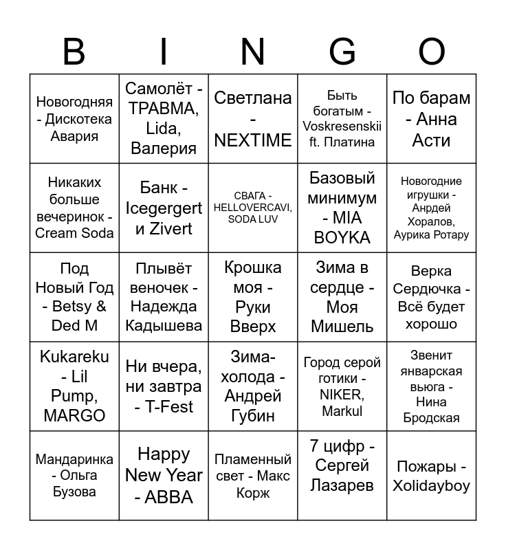 This bingo card has 25 words: Ни вчера, ни завтра - T-Fest, Пламенный свет - Макс Корж, СВАГА - HELLOVERCAVI, SODA LUV, Мандаринка - Ольга Бузова, По барам - Анна Асти, Новогодняя - Дискотека Авария, Никаких больше вечеринок - Cream Soda, Самолёт - ТРАВМА, Lida, Валерия, Зима в сердце - Моя Мишель, Зима-холода - Андрей Губин, Базовый минимум - MIA BOYKA, Под Новый Год - Betsy & Ded M, Город серой готики - NIKER, Markul, Звенит январская вьюга - Нина Бродская, Банк - Icegergert и Zivert, Пожары - Xolidayboy, Верка Сердючка - Всё будет хорошо, Светлана - NEXTIME, Новогодние игрушки - Анрдей Хоралов, Аурика Ротару, Плывёт веночек - Надежда Кадышева, Крошка моя - Руки Вверх, Happy New Year - ABBA, Kukareku - Lil Pump, MARGO, Быть богатым - Voskresenskii ft. Платина and 7 цифр - Сергей Лазарев.