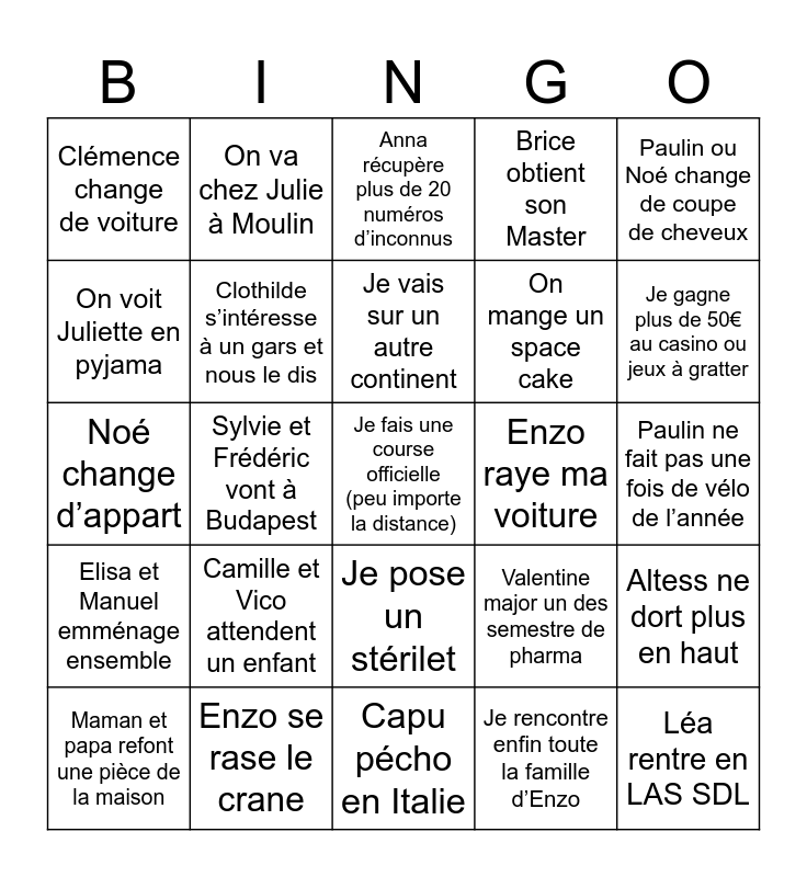 This bingo card has a free space and 24 words: Camille et Vico attendent un enfant, Enzo se rase le crane, Je vais sur un autre continent, Maman et papa refont une pièce de la maison, Paulin ou Noé change de coupe de cheveux, Clémence change de voiture, On voit Juliette en pyjama, On va chez Julie à Moulin, Enzo raye ma voiture, Je pose un stérilet, On mange un space cake, Noé change d’appart, Valentine major un des semestre de pharma, Altess ne dort plus en haut, Clothilde s’intéresse à un gars et nous le dis, Je rencontre enfin toute la famille d’Enzo, Paulin ne fait pas une fois de vélo de l’année, Anna récupère plus de 20 numéros d’inconnus, Je gagne plus de 50€ au casino ou jeux à gratter, Sylvie et Frédéric vont à Budapest, Léa rentre en LAS SDL, Elisa et Manuel emménage ensemble, Brice obtient son Master and Capu pécho en Italie.