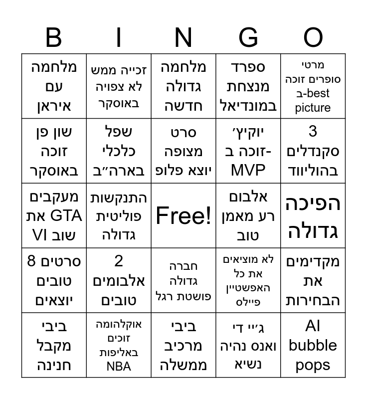 This bingo card has a free space and 24 words: 2 אלבומים טובים, אוקלהומה זוכים באליפות NBA, סרט מצופה יוצא פלופ, ביבי מקבל חנינה, מרטי סופרים זוכה ב-best picture, מלחמה עם איראן, שון פן זוכה באוסקר, זכייה ממש לא צפויה באוסקר, אלבום רע מאמן טוב, חברה גדולה פושטת רגל, יוקיץ׳ זוכה ב-MVP, מעקבים את GTA VI שוב, לא מוציאים את כל האפשטיין פיילס, מקדימים את הבחירות, שפל כלכלי בארה״ב, ג׳יי די ואנס נהיה נשיא, הפיכה גדולה, מלחמה גדולה חדשה, 3 סקנדלים בהוליווד, התנקשות פוליטית גדולה, AI bubble pops, 8 סרטים טובים יוצאים, ספרד מנצחת במונדיאל and ביבי מרכיב ממשלה.