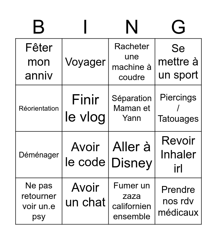 This bingo card has 16 words: Avoir un chat, Revoir Inhaler irl, Racheter une machine à coudre, Fêter mon anniv, Déménager, Voyager, Aller à Disney, Fumer un zaza californien ensemble, Réorientation, Finir le vlog, Ne pas retourner voir un.e psy, Se mettre à un sport, Avoir le code, Piercings / Tatouages, Séparation Maman et Yann and Prendre nos rdv médicaux.