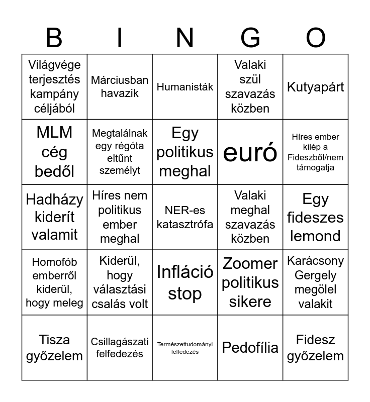 This bingo card has a free space and 24 words: Tisza győzelem, Kiderül, hogy választási csalás volt, Egy politikus meghal, Pedofília, Kutyapárt, Világvége terjesztés kampány céljából, Márciusban havazik, Humanisták, Valaki meghal szavazás közben, Egy fideszes lemond, Hadházy kiderít valamit, Megtalálnak egy régóta eltűnt személyt, Zoomer politikus sikere, Karácsony Gergely megölel valakit, MLM cég bedől, Csillagászati felfedezés, Természettudományi felfedezés, Valaki szül szavazás közben, Híres ember kilép a Fideszből/nem támogatja, Homofób emberről kiderül, hogy meleg, Híres nem politikus ember meghal, Infláció stop, euró and Fidesz győzelem.