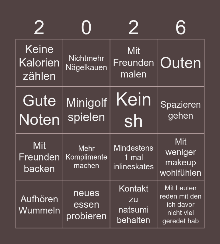 This bingo card has 16 words: Aufhören Wummeln, neues essen probieren, Mit Freunden malen, Outen, Gute Noten, Nichtmehr Nägelkauen, Mindestens 1 mal inlineskates, Mit weniger makeup wohlfühlen, Keine Kalorien zählen, Minigolf spielen, Kontakt zu natsumi behalten, Spazieren gehen, Mit Freunden backen, Mehr Komplimente machen, Kein sh and Mit Leuten reden mit den ich davor nicht viel geredet hab.