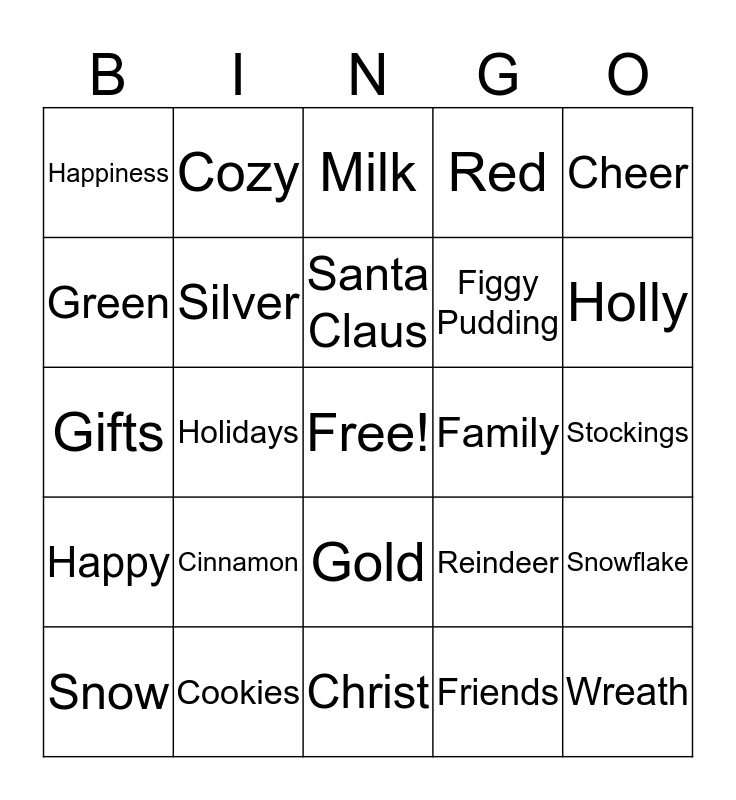 This bingo card has a free space and 35 words: Christmas, Tree, Decorate/Decorations, Silver, Gold, Red, Green, Santa, Santa Claus, Presents, Gifts, Cheer, Spirit, Joy, Happiness, Family, Friends, Holidays, Happy, Wreath, Reindeer, Snow, Snowflake, Cookies, Milk, Holly, Jingle, Ho Ho Ho!, Figgy Pudding, Stockings, Jesus, Christ, Cinnamon, Cozy and Candles.