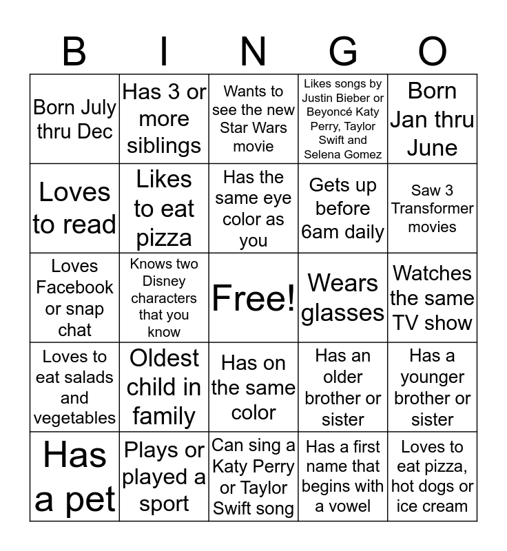 This bingo card has a free space and 24 words: Oldest child in family, Plays or played a sport, Has the same eye color as you, Has a pet, Born Jan thru June, Born July thru Dec, Loves to read, Has 3 or more siblings, Wears glasses, Has on the same color, Gets up before 6am daily, Loves Facebook or snap chat, Has an older brother or sister, Has a younger brother or sister, Likes to eat pizza, Has a first name that begins with a vowel, Watches the same TV show, Wants to see the new Star Wars movie, Saw 3 Transformer movies, Knows two Disney characters that you know, Loves to eat pizza, hot dogs or ice cream, Loves to eat salads and vegetables, Likes songs by Justin Bieber or Beyoncé Katy Perry, Taylor Swift and Selena Gomez and Can sing a Katy Perry or Taylor Swift song.