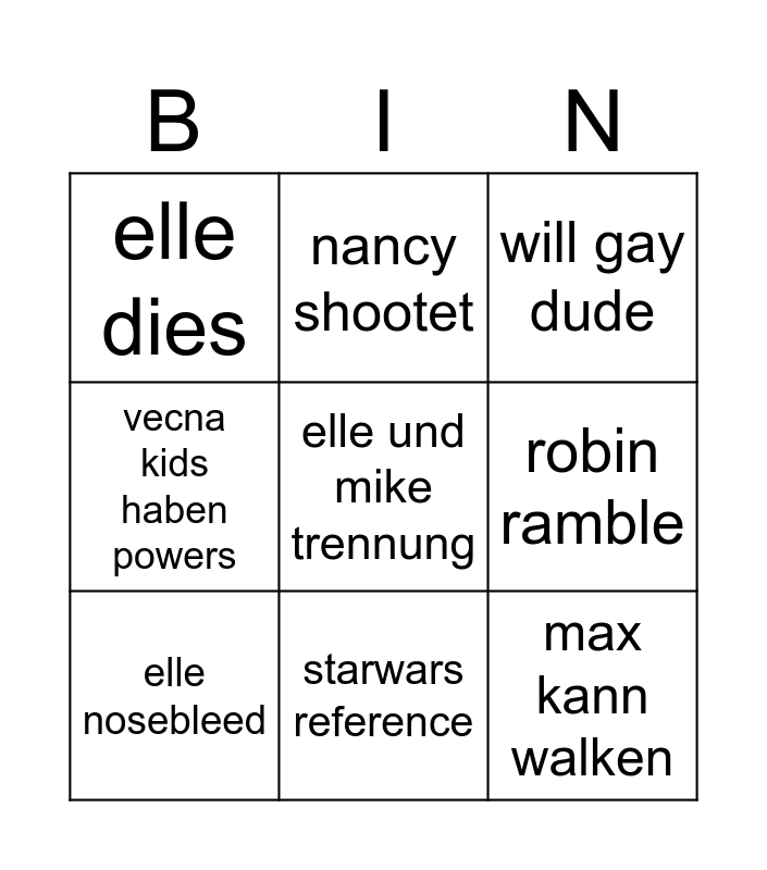 This bingo card has a free space and 8 words: robin ramble, will gay dude, nancy shootet, elle nosebleed, elle dies, max kann walken, vecna kids haben powers and starwars reference.