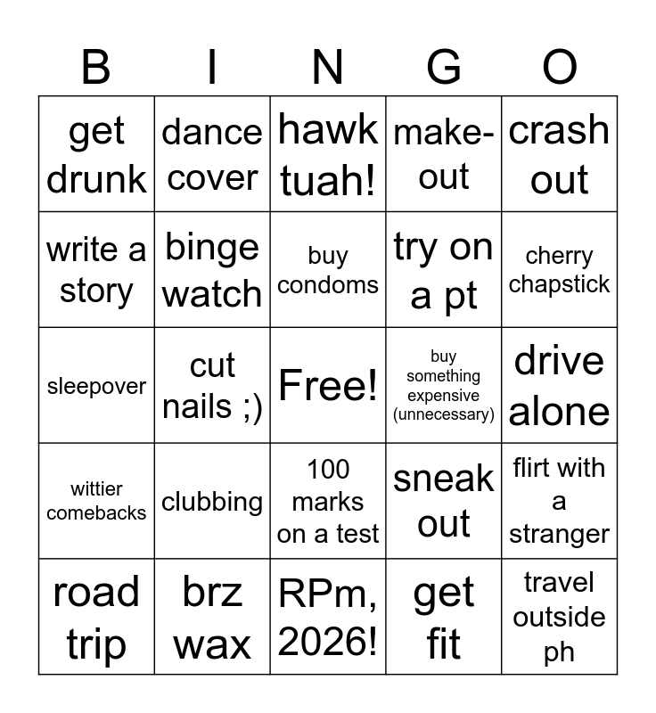 This bingo card has a free space and 24 words: clubbing, brz wax, buy condoms, road trip, crash out, get drunk, write a story, dance cover, buy something expensive (unnecessary), 100 marks on a test, try on a pt, sleepover, sneak out, flirt with a stranger, binge watch, get fit, drive alone, hawk tuah!, cherry chapstick, cut nails ;), travel outside ph, wittier comebacks, make-out and RPm, 2026!.