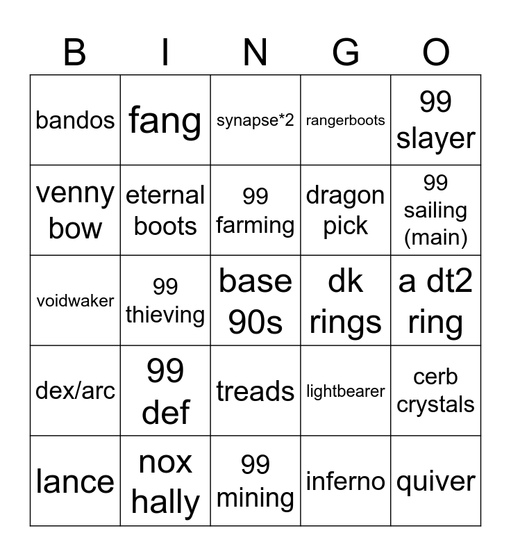 This bingo card has a free space and 24 words: 99 def, nox hally, 99 farming, lance, 99 slayer, bandos, venny bow, fang, dk rings, treads, dragon pick, voidwaker, lightbearer, cerb crystals, eternal boots, inferno, a dt2 ring, synapse*2, 99 sailing (main), 99 thieving, quiver, dex/arc, rangerboots and 99 mining.