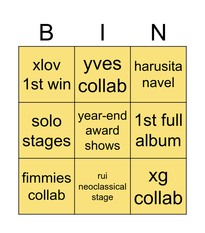 This bingo card has 9 words: fimmies collab, harusita navel, yves collab, solo stages, xlov 1st win, 1st full album, year-end award shows, xg collab and rui neoclassical stage.
