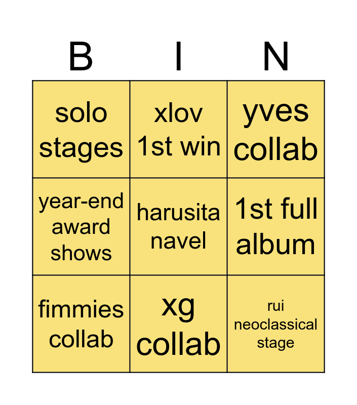 This bingo card has 9 words: fimmies collab, harusita navel, yves collab, solo stages, xlov 1st win, 1st full album, year-end award shows, xg collab and rui neoclassical stage.