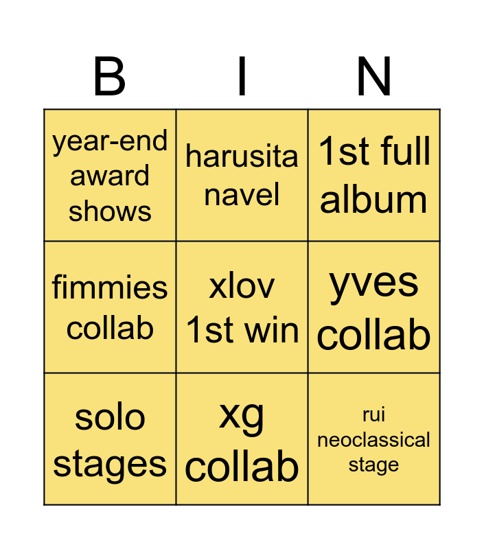 This bingo card has a free space and 8 words: fimmies collab, harusita navel, yves collab, solo stages, 1st full album, year-end award shows, xg collab and rui neoclassical stage.