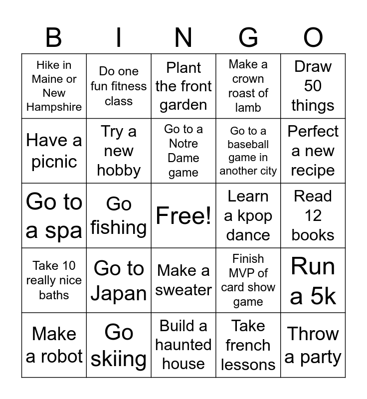 This bingo card has a free space and 38 words: Make a change in Roll20 that is outside of my team's work, Lose 30lb, Do a pushup, Try a new hobby, Run a 5k, Go to Japan, Go to a Notre Dame game, Learn to do a smoky eye, Draw 50 things, Go to a baseball game in another city, Go fishing, Make a crown roast of lamb, Throw a party, Read 12 books, Have a picnic, Take 10 really nice baths, Make a painting, Plant the front garden, Learn to wear heels, Learn a kpop dance, Hike in Maine or New Hampshire, Go skiing, Perfect a new recipe, Make a robot, Build a Christmas display, Build a haunted house, Go morel hunting, See golden aspens, Go camping (camper counts), Visit Portland, Get a fence, Make a sweater, Take french lessons, Do one fun fitness class, Reach 0 unfinished crochet projects, Finish MVP of card show game, Go to a spa and Stand on a mountain.
