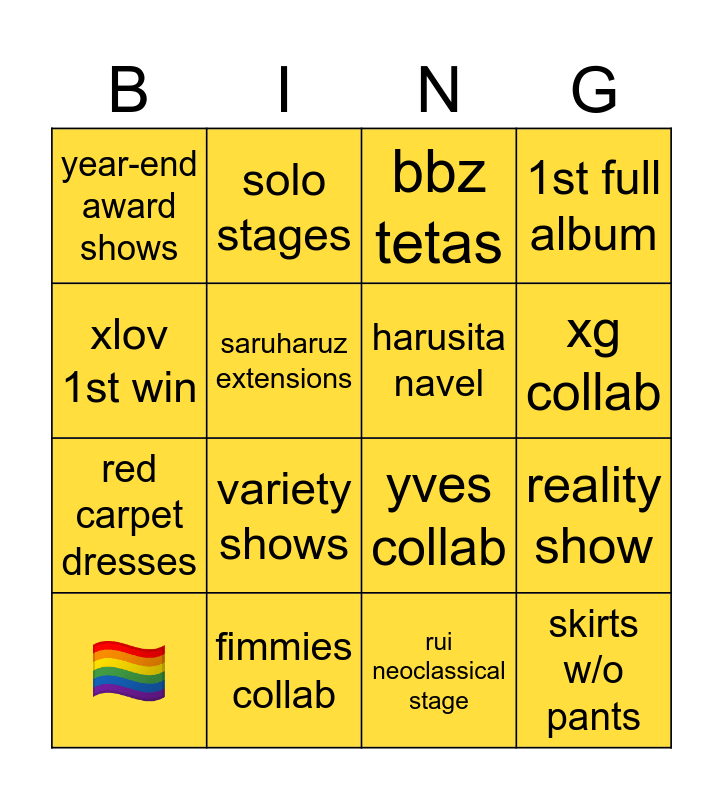 This bingo card has 16 words: fimmies collab, reality show, bbz tetas, year-end award shows, red carpet dresses, solo stages, yves collab, rui neoclassical stage, xlov 1st win, saruharuz extensions, 🏳️🌈, 1st full album, variety shows, xg collab, harusita navel and skirts w/o pants.