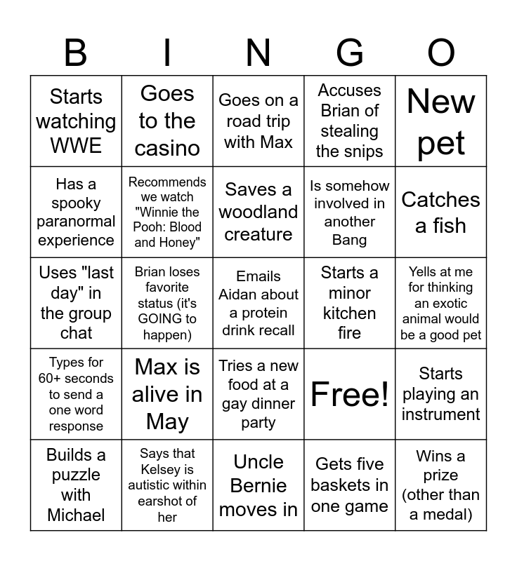 This bingo card has 25 words: Max is alive in May, Uncle Bernie moves in, Saves a woodland creature, Builds a puzzle with Michael, New pet, Starts watching WWE, Has a spooky paranormal experience, Goes to the casino, Starts a minor kitchen fire, Tries a new food at a gay dinner party, Is somehow involved in another Bang, Uses "last day" in the group chat, Free!, Starts playing an instrument, Recommends we watch "Winnie the Pooh: Blood and Honey", Wins a prize (other than a medal), Yells at me for thinking an exotic animal would be a good pet, Goes on a road trip with Max, Catches a fish, Brian loses favorite status (it's GOING to happen), Emails Aidan about a protein drink recall, Says that Kelsey is autistic within earshot of her, Types for 60+ seconds to send a one word response, Accuses Brian of stealing the snips and Gets five baskets in one game.