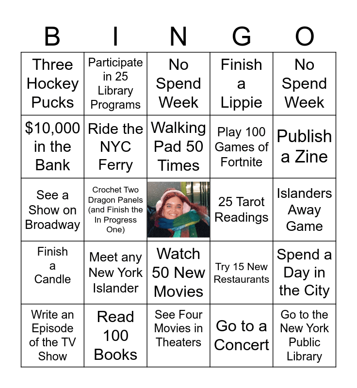 This bingo card has a free space and 24 words: Meet any New York Islander, Read 100 Books, Walking Pad 50 Times, Write an Episode of the TV Show, No Spend Week, Three Hockey Pucks, $10,000 in the Bank, Participate in 25 Library Programs, 25 Tarot Readings, Watch 50 New Movies, Play 100 Games of Fortnite, See a Show on Broadway, Try 15 New Restaurants, Spend a Day in the City, Ride the NYC Ferry, Go to a Concert, Islanders Away Game, No Spend Week, Publish a Zine, Crochet Two Dragon Panels (and Finish the In Progress One), Go to the New York Public Library, Finish a Candle, Finish a Lippie and See Four Movies in Theaters.