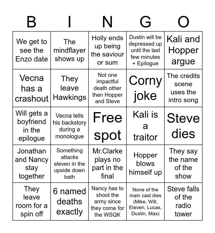 This bingo card has a free space and 24 words: Something attacks eleven in the upside down bath, 6 named deaths exactly, Not one impactful death other then Hopper and Steve, They leave room for a spin off, Kali and Hopper argue, We get to see the Enzo date, Vecna has a crashout, The mindflayer shows up, Kali is a traitor, Mr.Clarke plays no part in the final, Corny joke, Will gets a boyfriend in the epilogue, Hopper blows himself up, They say the name of the show, They leave Hawkings, None of the main cast dies (Mike, Will, Eleven, Lucas, Dustin, Max), Steve dies, Holly ends up being the saviour or sum, The credits scene uses the intro song, Vecna tells his backstory during a monologue, Steve falls of the radio tower, Jonathan and Nancy stay together, Dustin will be depressed up until the last few minutes + Epilogue and Nancy has to shoot the army since they come for the WSQK.