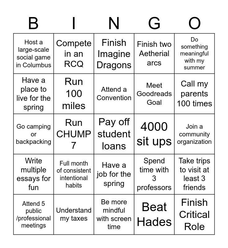 This bingo card has a free space and 24 words: Full month of consistent intentional habits, Understand my taxes, Attend a Convention, Attend 5 public /professional meetings, Do something meaningful with my summer, Host a large-scale social game in Columbus, Have a place to live for the spring, Compete in an RCQ, 4000 sit ups, Have a job for the spring, Meet Goodreads Goal, Go camping or backpacking, Spend time with 3 professors, Take trips to visit at least 3 friends, Run 100 miles, Beat Hades, Join a community organization, Finish Imagine Dragons, Call my parents 100 times, Run CHUMP 7, Finish Critical Role, Write multiple essays for fun, Finish two Aetherial arcs and Be more mindful with screen time.