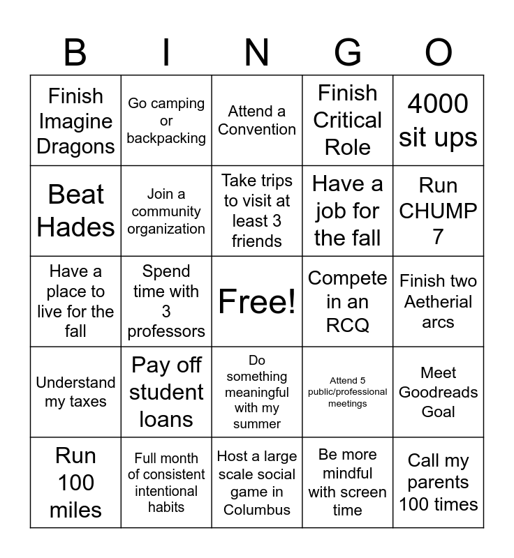This bingo card has a free space and 25 words: Pay off student loans, Host a large scale social game in Columbus, Take trips to visit at least 3 friends, Run 100 miles, 4000 sit ups, Finish Imagine Dragons, Beat Hades, Go camping or backpacking, Compete in an RCQ, Do something meaningful with my summer, Have a job for the fall, Have a place to live for the fall, Attend 5 public/professional meetings, Meet Goodreads Goal, Join a community organization, Write multiple essays for fun, Finish two Aetherial arcs, Attend a Convention, Run CHUMP 7, Spend time with 3 professors, Call my parents 100 times, Full month of consistent intentional habits, Understand my taxes, Finish Critical Role and Be more mindful with screen time.