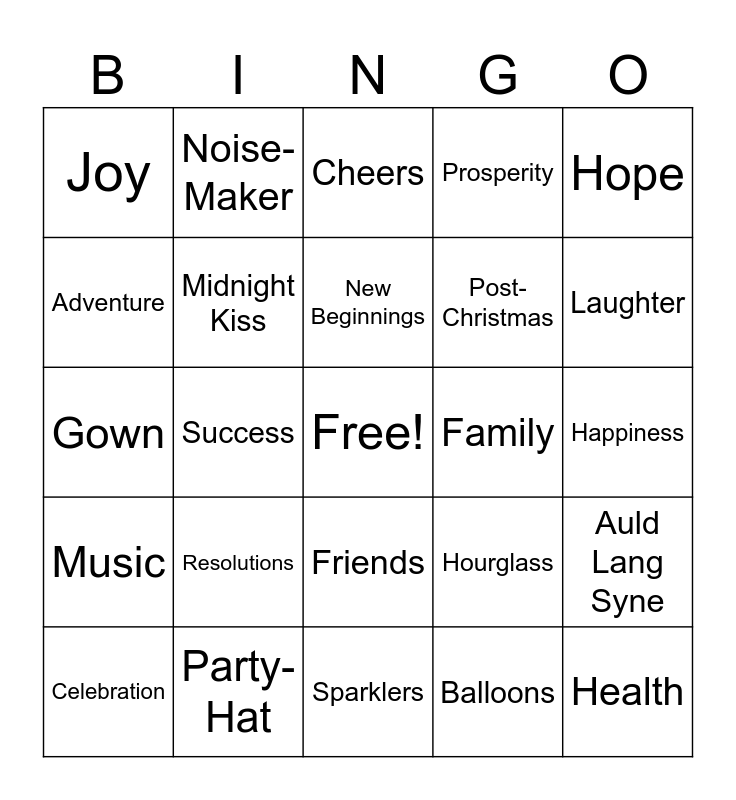 This bingo card has a free space and 37 words: Countdown, Ball Drop, Fireworks, Midnight Kiss, Auld Lang Syne, Resolutions, New Beginnings, Goals, Hope, Dreams, Success, Prosperity, Health, Happiness, Adventure, Music, Dancing, Cheers, Friends, Family, Joy, Laughter, Celebration, Sparklers, Confetti, Balloons, Noise-Maker, Times-Square, Vow, Parade, Invitation, Party-Hat, Gown, Holiday, Hourglass, Post-Christmas and Horns.