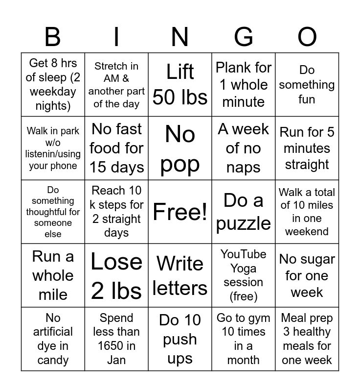 This bingo card has a free space and 24 words: Lose 2 lbs, Spend less than 1650 in Jan, No pop, No artificial dye in candy, Do something fun, Get 8 hrs of sleep (2 weekday nights), Walk in park w/o listenin/using your phone, Stretch in AM & another part of the day, Do a puzzle, Write letters, A week of no naps, Do something thoughtful for someone else, YouTube Yoga session (free), No sugar for one week, No fast food for 15 days, Go to gym 10 times in a month, Walk a total of 10 miles in one weekend, Lift 50 lbs, Run for 5 minutes straight, Reach 10 k steps for 2 straight days, Meal prep 3 healthy meals for one week, Run a whole mile, Plank for 1 whole minute and Do 10 push ups.