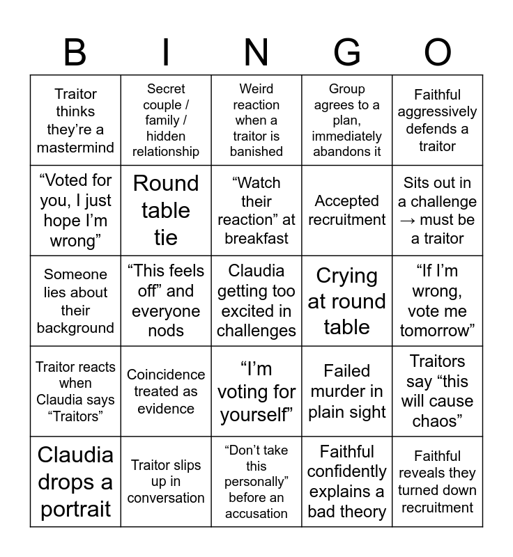 This bingo card has a free space and 24 words: Coincidence treated as evidence, Traitor slips up in conversation, “Watch their reaction” at breakfast, Claudia drops a portrait, Faithful aggressively defends a traitor, Traitor thinks they’re a mastermind, “Voted for you, I just hope I’m wrong”, Secret couple / family / hidden relationship, Crying at round table, “I’m voting for yourself”, Accepted recruitment, Someone lies about their background, Failed murder in plain sight, Traitors say “this will cause chaos”, Round table tie, Faithful confidently explains a bad theory, “If I’m wrong, vote me tomorrow”, Weird reaction when a traitor is banished, Sits out in a challenge → must be a traitor, “This feels off” and everyone nods, Faithful reveals they turned down recruitment, Traitor reacts when Claudia says “Traitors”, Group agrees to a plan, immediately abandons it and “Don’t take this personally” before an accusation.