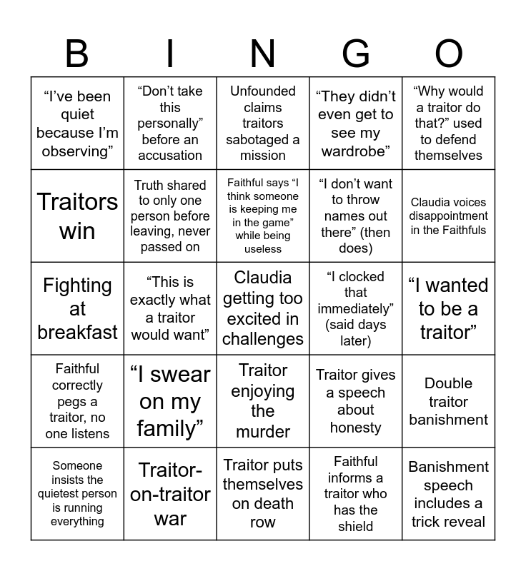 This bingo card has a free space and 24 words: “I swear on my family”, Traitor-on-traitor war, Faithful says “I think someone is keeping me in the game” while being useless, Someone insists the quietest person is running everything, “Why would a traitor do that?” used to defend themselves, “I’ve been quiet because I’m observing”, Traitors win, “Don’t take this personally” before an accusation, “I clocked that immediately” (said days later), Traitor enjoying the murder, “I don’t want to throw names out there” (then does), Fighting at breakfast, Traitor gives a speech about honesty, Double traitor banishment, Truth shared to only one person before leaving, never passed on, Faithful informs a traitor who has the shield, “I wanted to be a traitor”, Unfounded claims traitors sabotaged a mission, Claudia voices disappointment in the Faithfuls, “This is exactly what a traitor would want”, Banishment speech includes a trick reveal, Faithful correctly pegs a traitor, no one listens, “They didn’t even get to see my wardrobe” and Traitor puts themselves on death row.
