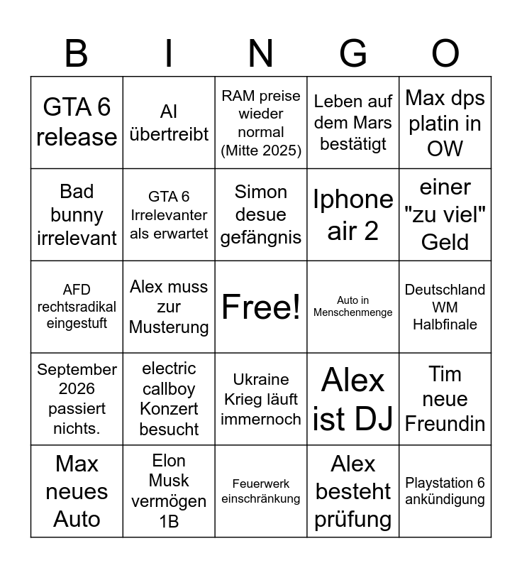 This bingo card has a free space and 24 words: Max neues Auto, electric callboy Konzert besucht, Simon desue gefängnis, Alex besteht prüfung, Max dps platin in OW, GTA 6 release, AI übertreibt, RAM preise wieder normal (Mitte 2025), Auto in Menschenmenge, Deutschland WM Halbfinale, AFD rechtsradikal eingestuft, GTA 6 Irrelevanter als erwartet, Alex ist DJ, Tim neue Freundin, Bad bunny irrelevant, Elon Musk vermögen 1B, Feuerwerk einschränkung, Leben auf dem Mars bestätigt, einer "zu viel" Geld, September 2026 passiert nichts., Alex muss zur Musterung, Ukraine Krieg läuft immernoch, Iphone air 2 and Playstation 6 ankündigung.