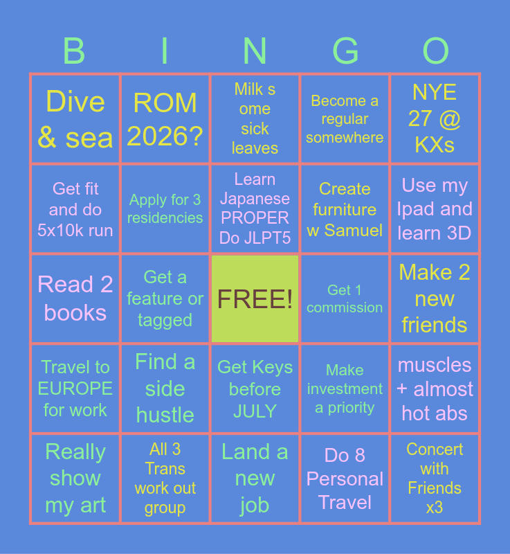 This bingo card has a free space and 24 words: Find a side hustle, All 3 Trans work out group, Learn Japanese PROPER Do JLPT5, Really show my art, NYE 27 @ KXs, Dive & sea, Get fit and do 5x10k run, ROM 2026?, Get 1 commission, Get Keys before JULY, Create furniture w Samuel, Read 2 books, Make investment a priority, muscles + almost hot abs, Apply for 3 residencies, Do 8 Personal Travel, Make 2 new friends, Milk some sick leaves, Use my Ipad and learn 3D, Get a feature or tagged, Concert with Friends x3, Travel to EUROPE for work, Become a regular somewhere and Land a new job.