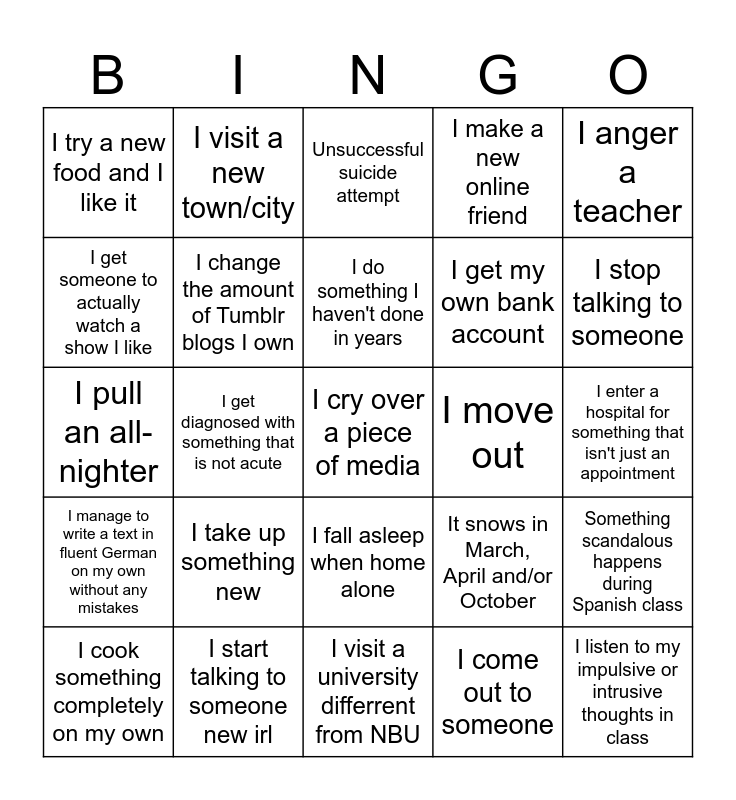 This bingo card has a free space and 27 words: It snows in March, April and/or October, I get hit by static electricity coming from a random object, I get my own bank account, I visit a university differrent from NBU, I get someone to actually watch a show I like, Unsuccessful suicide attempt, I visit a new town/city, I manage to write a text in fluent German on my own without any mistakes, I move out, Something scandalous happens during Spanish class, I pull an all-nighter, I make a new online friend, I cook something completely on my own, I start talking to someone new irl, I stop talking to someone, Someone says I'm acting immature, I change the amount of Tumblr blogs I own, I do something I haven't done in years, I take up something new, I try a new food and I like it, I enter a hospital for something that isn't just an appointment, I come out to someone, I get diagnosed with something that is not acute, I listen to my impulsive or intrusive thoughts in class, I fall asleep when home alone, I anger a teacher and I cry in Spanish, CE or Chem class.
