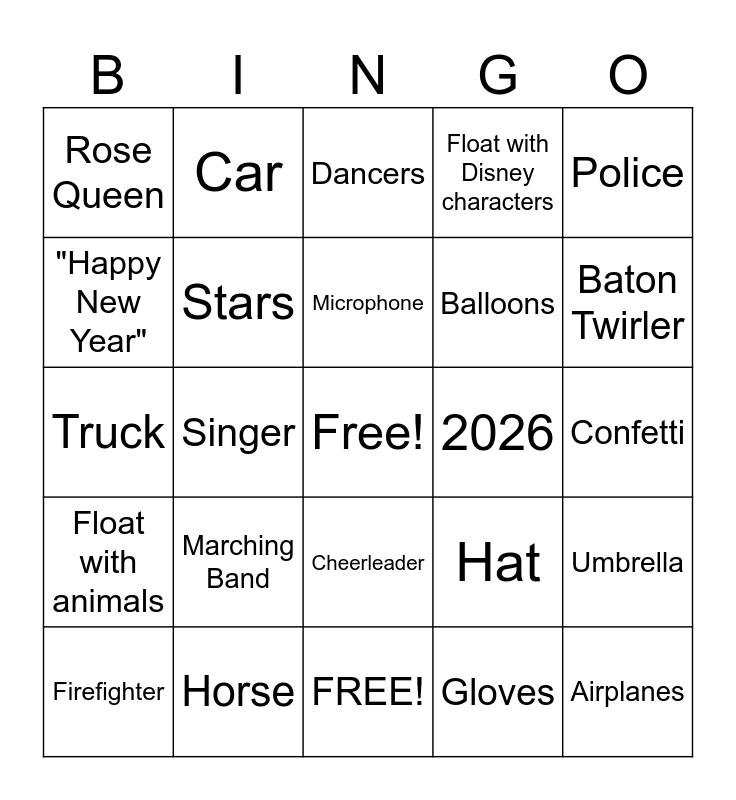 This bingo card has a free space and 24 words: Marching Band, Horse, Microphone, Firefighter, Police, Rose Queen, "Happy New Year", Car, 2026, Cheerleader, Balloons, Truck, Hat, Umbrella, Stars, Gloves, Confetti, Dancers, Baton Twirler, Singer, Airplanes, Float with animals, Float with Disney characters and FREE!.