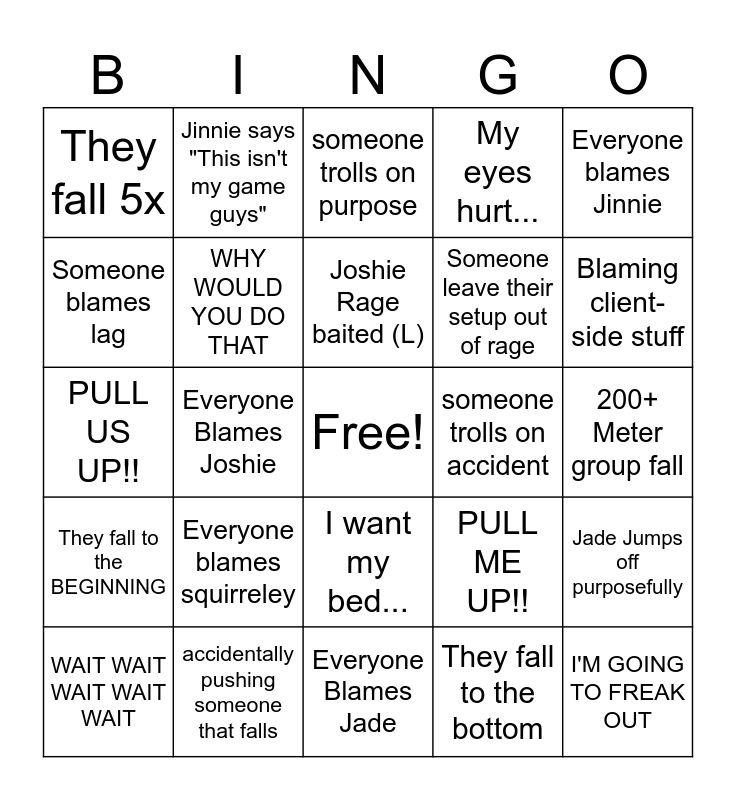 This bingo card has a free space and 24 words: Everyone blames squirreley, accidentally pushing someone that falls, Joshie Rage baited (L), WAIT WAIT WAIT WAIT WAIT, Everyone blames Jinnie, They fall 5x, Someone blames lag, Jinnie says "This isn't my game guys", someone trolls on accident, I want my bed..., Someone leave their setup out of rage, PULL US UP!!, PULL ME UP!!, Jade Jumps off purposefully, WHY WOULD YOU DO THAT, They fall to the bottom, 200+ Meter group fall, someone trolls on purpose, Blaming client-side stuff, Everyone Blames Joshie, I'M GOING TO FREAK OUT, They fall to the BEGINNING, My eyes hurt... and Everyone Blames Jade.