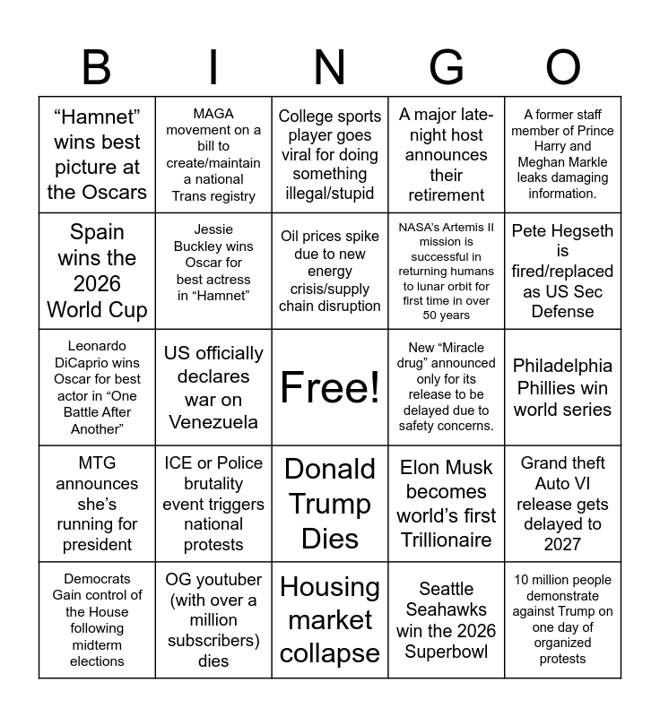 This bingo card has a free space and 24 words: ICE or Police brutality event triggers national protests, OG youtuber (with over a million subscribers) dies, Oil prices spike due to new energy crisis/supply chain disruption, Democrats Gain control of the House following midterm elections, A former staff member of Prince Harry and Meghan Markle leaks damaging information., “Hamnet” wins best picture at the Oscars, Spain wins the 2026 World Cup, MAGA movement on a bill to create/maintain a national Trans registry, New “Miracle drug” announced only for its release to be delayed due to safety concerns., Donald Trump Dies, NASA’s Artemis II mission is successful in returning humans to lunar orbit for first time in over 50 years, Leonardo DiCaprio wins Oscar for best actor in “One Battle After Another”, Elon Musk becomes world’s first Trillionaire, Grand theft Auto VI release gets delayed to 2027, Jessie Buckley wins Oscar for best actress in “Hamnet”, Seattle Seahawks win the 2026 Superbowl, Philadelphia Phillies win world series, College sports player goes viral for doing something illegal/stupid, Pete Hegseth is fired/replaced as US Sec Defense, US officially declares war on Venezuela, 10 million people demonstrate against Trump on one day of organized protests, MTG announces she’s running for president, A major late-night host announces their retirement and Housing market collapse.