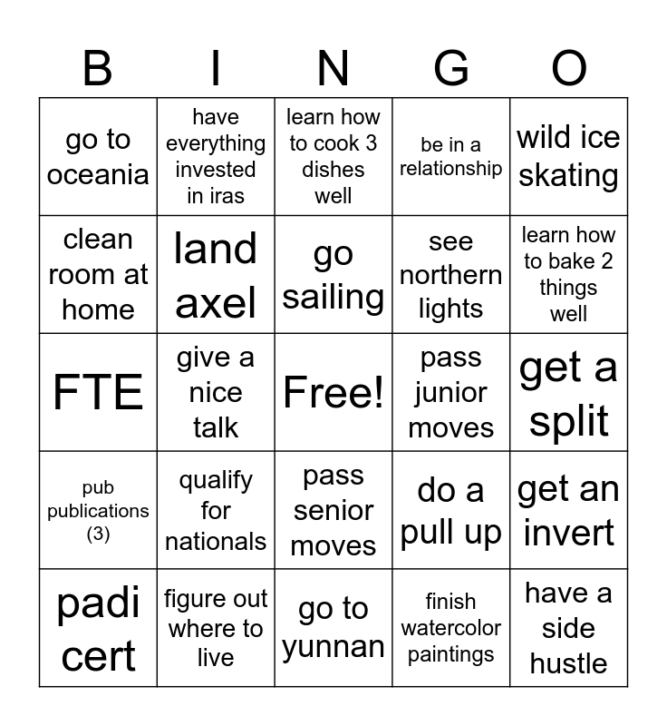 This bingo card has a free space and 24 words: qualify for nationals, figure out where to live, go sailing, padi cert, wild ice skating, go to oceania, clean room at home, have everything invested in iras, pass junior moves, pass senior moves, see northern lights, FTE, do a pull up, get an invert, land axel, finish watercolor paintings, get a split, learn how to cook 3 dishes well, learn how to bake 2 things well, give a nice talk, have a side hustle, pub publications (3), be in a relationship and go to yunnan.