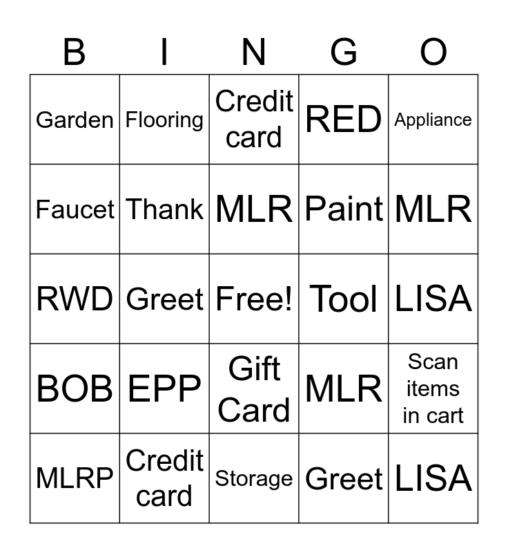 This bingo card has a free space and 24 words: EPP, Credit card, MLR, MLRP, Appliance, Garden, Faucet, Flooring, Tool, Gift Card, Paint, RWD, MLR, Scan items in cart, Thank, Greet, LISA, Credit card, MLR, Greet, LISA, BOB, RED and Storage.