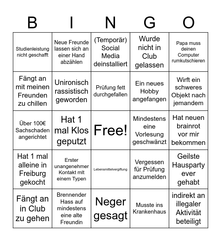 This bingo card has a free space and 24 words: Erster unangenehmer Kontakt mlt einem Typen, Brennender Hass auf mindestens eine alte Freundin, Prüfung fett durchgefallen, Fängt an in Club zu gehen, Papa muss deinen Computer rumkutschieren, Studienleistung nicht geschafft, Fängt an mit meinen Freunden zu chillen, Neue Freunde lassen sich an einer Hand abzählen, Mindestens eine Vorlesung geschwänzt, Lebensmittelvergiftung, Ein neues Hobby angefangen, Über 100€ Sachschaden angerichtet, Vergessen für Prüfung anzumelden, Geilste Hausparty ever gehabt, Unironisch rassistisch geworden, Musste ins Krankenhaus, Hat neuen brainrot vor mir bekommen, (Temporär) Social Media deinstalliert, Wirft ein schweres Objekt nach jemandem, Hat 1 mal Klos geputzt, indirekt an illegaler Aktivität beteiligt, Hat 1 mal alleine in Freiburg gekocht, Wurde nicht in Club gelassen and Neger gesagt.