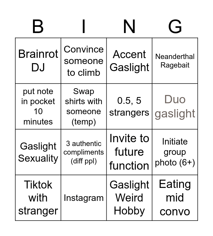 This bingo card has 16 words: Instagram, Initiate group photo (6+), Accent Gaslight, Brainrot DJ, Gaslight Sexuality, Convince someone to climb, Invite to future function, Gaslight Weird Hobby, put note in pocket 10 minutes, Swap shirts with someone (temp), Tiktok with stranger, Neanderthal Ragebait, 3 authentic compliments (diff ppl), Duo gaslight, 0.5, 5 strangers and Eating mid convo.