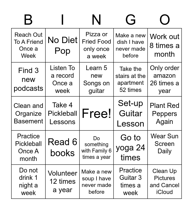 This bingo card has a free space and 24 words: Do not drink 1 night a week, Read 6 books, Learn 5 new Songs on guitar, Practice Guitar 3 times a week, Work out 8 times a month, Reach Out To A Friend Once a Week, No Diet Pop, Pizza or Fried Food only once a week, Set-up Guitar Lesson, Plant Red Peppers Again, Clean and Organize Basement, Listen To a record Once a week, Go to yoga 24 times, Wear Sun Screen Daily, Find 3 new podcasts, Volunteer 12 times a year, Make a new soup I have never made before, Make a new dish I have never made before, Only order amazon 26 times a year, Practice Pickleball Once A month, Take 4 Pickleball Lessons, Do something with Family 6 times a year, Take the stairs at the apartment 52 times and Clean Up Pictures and Cancel iCloud.