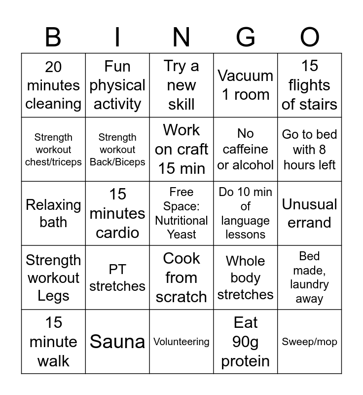 This bingo card has a free space and 34 words: Eat a vegetable, Eat 90g protein, Take creatine/iron, Eat a fruit, Strength workout Legs, Strength workout Back/Biceps, 15 flights of stairs, 15 minute walk, Fun physical activity, Read 5 pages, Work on craft 15 min, Try a new skill, Social hangout 30 minutes, 2 hours no phone, Do 10 min of language lessons, Go to bed with 8 hours left, Sauna, Relaxing bath, PT stretches, Whole body stretches, Cook from scratch, Prep 3 meals, 20 minutes cleaning, Unusual errand, Volunteering, Sweep/mop, Vacuum 1 room, 10 minutes organizing, No caffeine or alcohol, Strength workout chest/triceps, Strength workout forearms and core, 15 minutes cardio, Bed made, laundry away and Kitchen totally clean.